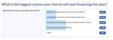 There are many reasons that churches seek financing and in January we ran a poll on our Facebook page to find out what churches thought they would need this year. Our results were a tie indicating that most churches will be seeking church loans for new homes or renovations in the upcoming months.